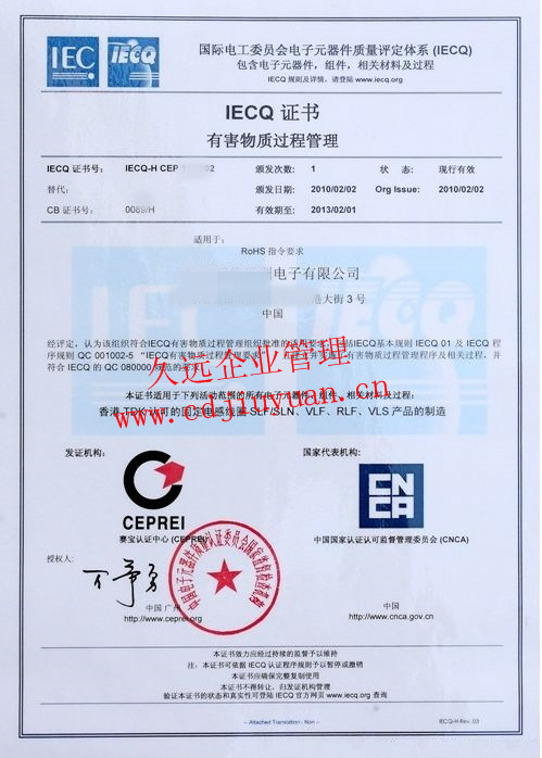 有害物質(zhì)過程管理體系認證證書