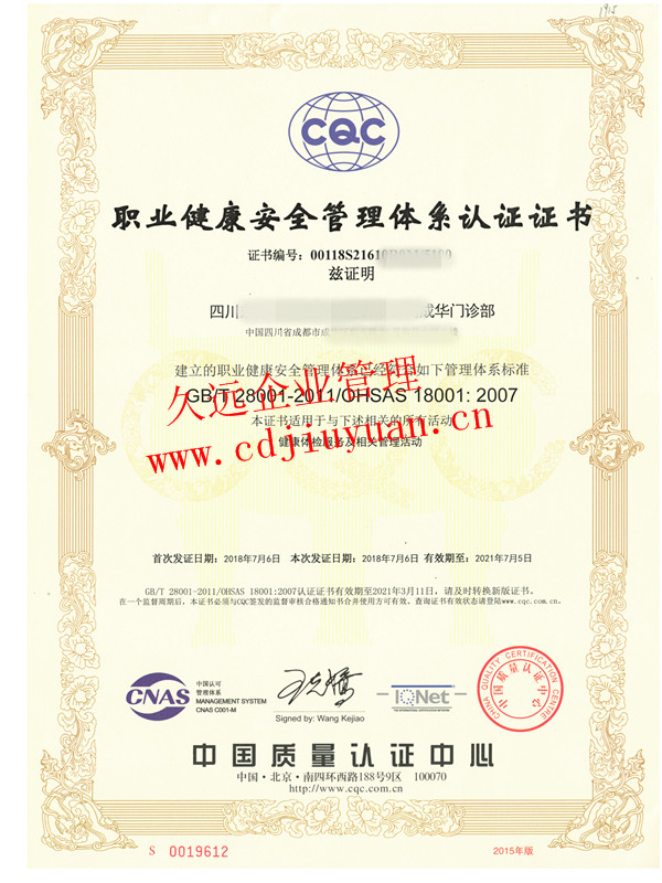 職業(yè)健康安全管理體系認證證書