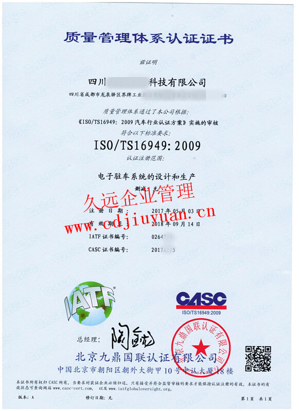 IATF16949汽車質(zhì)量管理體系認證證書